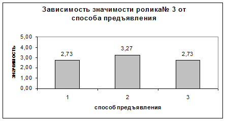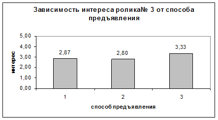 По шкалам интерес и значимость ролика №3 тоже получены достаточно интересные результаты. По шкале значимости способ предъявления только визуального ряда, получает оценку 3,27, что является самой высокой оценкой для данного ролика в зависимости от способа предъявления. А по шкале интереса, самые высокие значения получает способ предъявления только аудиального ряда рекламного сообщения, - 3,33.