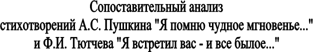 Таким образом, сопоставительный анализ стихотворений А. С. Пушкина «Я помню чудное мгновенье…» и Ф. И. Тютчева «Я встретил вас – и все былое…» позволяют нам увидеть великих художников слова, создавших яркие образы русской поэзии, глубокие по содержанию и изящные по форме.