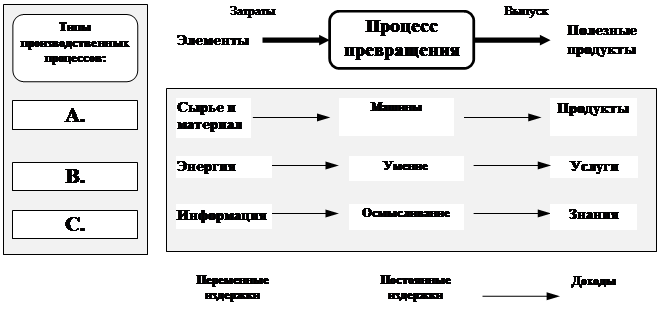 есть целенаправленный процесс, благодаря которому происходит превращение отдельных элементов в полезную продукцию. Иными словами, она представляет собой определенную технологию, в соответствии с которой завершается трансформация затрат в продукцию , см. рис 1.