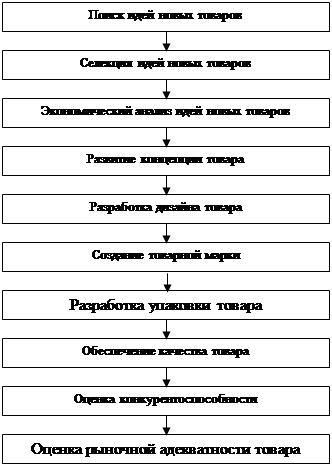 Затем необходимо проанализировать этапы разработки новых продуктов. Опубликованные в настоящее время схемы разработки новых товаров, как правило, включают следующие этапы: генерация идей, отбор (селекция) идей, разработка концепции нового продукта, ее проверка, разработка маркетинговой стратегии, анализ перспективности бизнеса, разработка непосредственно продукта, пробный маркетинг и коммерческое производство. Но по мнению доктора физико-математических наук, профессора экономики Попова Е.В. данная последовательность этапов носит достаточно общий интегрированный характер, и не содержит детального обсуждения целого ряда значимых блоков маркетинговой деятельности предприятия, таких как элементы маркетинговой разработки товара, включающие форму, цвет и материал продукта, оценку рыночной адекватности товара и его конкурентоспособности, а также прогнозирование сбыта товаров и разработку товарной политики предприятия. Это, а также составляющие понятие “новый товар” рассмотрены в первой главе.
