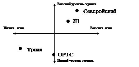 Проведем позиционирование услуг продажи строительных материалов. Как уже упоминалось, в Мурманске существует несколько фирм, занимающихся предоставлением услуг такого рода. Потребителей, пользующихся услугами этих фирм, интересуют прежде всего два параметра: цена и уровень сервиса. Проведем позиционирование данной услуги по эти двум параметрам на примере предприятий: