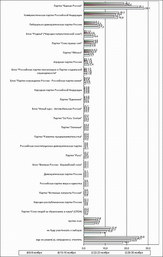 Итоги деятельности "Яблока" со СМИ отражены в итоговых рейтинга проведенных накануне выборов.(рис 4 Вопрос: если вы примете участие в выборах в декабре этого года, за какую партию вы скорее всего проголосуете).