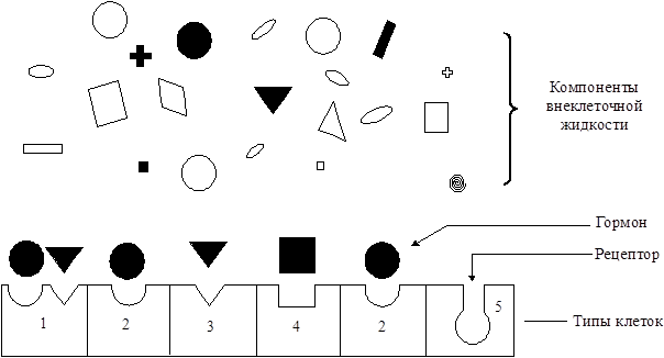 Одна из трудно разрешимых проблем, с которой встречались исследователи при описании системы коммуникации, основной на использовании гормонов, представлено на схеме (рис. 1). Во внеклеточной жидкости гормоны присутствуют в очень низкой концентрации – обычно в пределах 10(-15) - 10(-19) моль/л. Это на много ниже содержание других, структурно сходных соединений (стеролов, аминокислот, пептидов, белков) и иных веществ, каторые находятся в крови в концентрации 10(-5) – 10(-3) моль/л. Следовательно, клетки-мишени должны отличать данный гормон не только от других гормонов, присутствующих в малых количествах, но и от прочих соединений, присутствующих в 10(6)– 10(9) – кратном количестве. Столь высокую степень избирательности обеспечивают особые принадлежащие клетке молекулы узнавания, называемые рецепторы.
