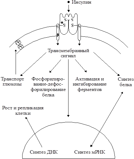 . Действие инсулина начинается с его связывания со специфическим гликопротеиновым рецептором на поверхности клетки-мишени. Различные эффекты этого гормона (рис 2.) могут проявляться либо через несколько секунд или минут (транспорт, фосфорилирование белков, активации и ингибирование ферментов, синтез РНК), либо через несколько часов (синтез белка и ДНК и клеточный рост).