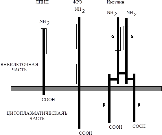 ФРЭ.Рис 3. Схема строения рецепторов липопротеинов низкой плотности (ЛПНП), фактора роста эпидермиса (ФРЭ) и инсулина. В каждом из этих рецепторов аминоконцы находятся в той части молекулы, которая выступает из клетки. Рамками обозначены участки, богатые цистеином, которые, как считают, участвуют в связывании лиганда. В каждом рецепторе (~25 аминокислот) имеется короткий домен, пересекающий плазматическу мембрану (серая полоса), и внутриклеточный домен варьирующей длинны. Рецепторы ФРЭ и инсулина обладают тирозинкиназной активностью, локализованном в цитоплазматическом домене; кроме того, в этом домене находятся участки, в которых происходит аутофосфорилирование. Инсулиновый рецептор представляет собой гетеротетрамер, отдельные цепи (вертикальные полосы) которые связаны между собой дисульфидными мостиками.