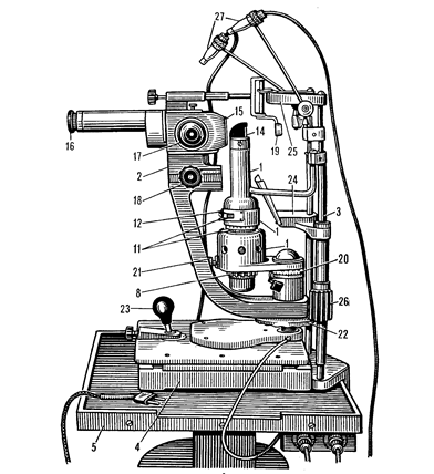 С этой целью используют щелевые лампы отечественного производстваЩЛ-56, ЩЛТ, ЩЛ-56М или зарубежные лампы с фотонасадкой фирмы "Карл Цейс" (Йена) и др. Испытуемый занимает физиологическое положение за прибором, для чего подбирается оптимальная высота вращающегося стула или регулируемого кресла и удобное положение головы на лицевом установе.