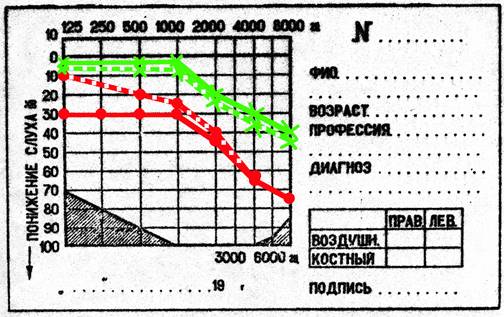 Заключение: Изменения на аудиограмме характерны для нарушения звуковосприятия. Изменения больше выражены справа.