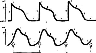 При возбуждении клетки резко изменяется проницаемость ее стенки по отношению к ионам различных типов. Это приводит к изменению ионных потоков через клеточную мембрану и, следовательно, к изменению величины самого ТМПП. Кривая изменения трансмембранного потенциала во время возбуждения получила название трансмембранного потенциала действия (ТМПД). Различают несколько фаз ТМПД миокардинальной клетки (рисунок 1).