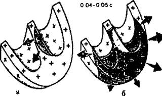 Клетка миокарда в покое (А) и во время деполяризации (Б).