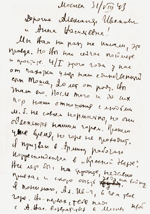 Факсимиле письма А. Платонова «…Я сделал здесь на войне столь важные выводы из… смерти»… «Любовь, смерть и душа – явления совершенно торжественные…» Что же такое подвиг – смерть на войне, как не высшее проявление любви к своему народу, завещанной нам в духовное наследство? Какой смысл в подвижничестве без терпения и страдания? Мужество тем выше, чем глубже горе – одного без другого не бывает…