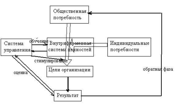 Такое разрешение противоречий возможно лишь при предварительной «обработке» индивидуальных целей в системе внутрифирменных ценностей. Это организационное образование представляет собой те нормы поведения, те ценности и правила, которые выработались в ходе жизнедеятельности и признаются большинством сотрудников. Сюда входят также мифы и легенды фирмы, которые возникли и функционируют в ходе ее развития. С помощью данной системы ценностей новые работники имеют возможность быстрее включатся в общий климат организации, осваивать новые для них виды и приемы работы, а также корректировать собственные потребности с учетом общих.