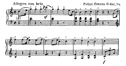 В самом начале работы над сонатой я указала на связь фортепианного изложения ранних венских классиков с квартетно- оркестровым письмом, а также сочла необходимым углубить представление студентки о метро- ритмических особенностях творчества Гайдна. Я рассказала о том, что в его произведениях метро- ритмическая организация в значительной мере придаёт музыке ясность, активный, жизнеутверждающий характер. Я обращаю внимание студентки на то, что при исполнении классических сонат надо всегда очень отчетливо ощущать сильные доли такта. Особенно важно это в затактных построениях и при синкопах, потому что без ощущения постоянных центров тяготения мотивов к сильной доле в этих случаях происходит как бы смещение тактовой черты и смысл музыки совершенно искажается. Далее мы говорим о ритмическом пульсе, скрепляющем воедино отдельные разделы произведения.