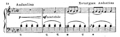 В этой пьесе простота фактурных средств сочетается с воплощением глубоких душевных переживаний. Обсуждая характер мелодии, говорю студентке, что по сути - это широко льющаяся лирическая песня, пронизанная ярким национальным колоритом. При этом замечаю, что ее простой ритмический рисунок не может быть передан лишь элементарной точностью воспроизведения длительностей. Здесь заходит речь об агогике, о том, что единство темпа (о нем будет сказано ниже) не противоречит небольшим отклонениям от него, обусловленным теми или иными художественными задачами. Иначе исполнение будет невыразительным, автоматичным. Обсуждаем небольшие замедления или ускорения внутри фраз, которые необходимы для рельефного выявления наиболее значительных интонаций мелодии. Так, уже первая фраза, начинающаяся со скорбной «молящей» интонации (до—