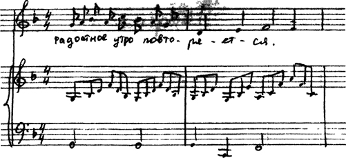 Романс написан на бессмертные стихи А.С. Пушкина. Спрашиваю у студентки, какие еще вокальные и хоровые произведения на стихи Пушкина она знает. Подумав, называет несколько. Студентке романс нравится, работает над ним увлечённо, с нескрываемым удовольствием. Стремясь как можно скорее исполнять романс в нужных темпах и в образе, учащаяся недостаточно чутко отнеслась к ритмическим особенностям аккомпанемента, вследствие чего во время домашней подготовки образовалась стойкая погрешность при исполнении пунктирного ритма в триольном размере и синкопы. Я бы отнесла эту ритмическую неточность к разряду «типичных» случаев, так как неоднократно наблюдала как эта ритмическая фигура, особенно исполняемая в быстром темпе, имеет тенденцию превратиться в простые или . Я считаю недопустимым превращать трехдольный размер в двухдольный. Особенно, если учесть, что эта ошибка искажает поэтический образ и является серьёзной разрушительной силой ансамбля, так как именно в этих местах фортепианное сопровождение дублирует вокальную партию. Для исправления этой ритмической неточности я прибегла к методу показа, но студентке все равно эта ритмическая фигурация никак не удавалась. Тогда я решила применить метод преувеличения (в данном случае ритмический-агогический), который заключается в том, что я советую ученице остановиться подольше на первой доле, как бы сделать на ней маленькую фермату , а так же несколько раз проиграть совершенно ровно, чтобы лучше осознать трёхдольность фигуры: . Прошу её также поиграть с пропуском шестнадцатой , затем сыграть так: , умышленно превращая шестнадцатую в форшлаг (опять преувеличение). Должна добавить, что неоценимую помощь в работе над подобными ритмическими фигурами оказывают так называемые «вспомогательные» слова. Я произносила их сама и заставляла петь учащуюся: «ми – лая», «ду - рочка» с очень энергичным акцентом на первом слоге, и дело наладилось. В результате студентка с романсом справилась, стала более чуткой в ансамбле с солистом и успешно сдала его, ярко выступив на зачете.