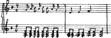 Что же касается собственно усвоения, «слуховой ассимиляции» ритмических рисунков учащимся фортепианного класса, то тут принципиально важен факт, что «осязание» метроритмической ткани произведения проистекает непосредственно в ходе его разучивания. Неоднократное восприятие и воспроизведение музыки, ее ритмического орнамента, сотканного в подавляющем большинстве случаев из множества разнохарактерных, отличающихся друг от друга узоров и фигур, ведет к тому. что последние, как показывает мой опыт, очень хорошо запоминаются сознанием. По мере продолжения и углубления работы над музыкальным произведением у учащегося-пианиста складываются все более яркие и устойчивые представления о содержащихся в данном произведении метроритмических рисунках, фигурах, комбинациях и т.д., что в итоге и означает упрочение одной из существенных сторон музыкально-ритмического чувства.