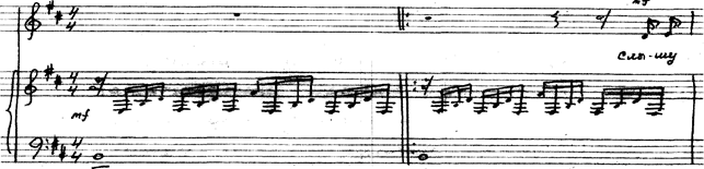 . Подобными образными красками характеризуются и все последующие построения первой части пьесы. В них важно показать не только рельефное интонирование половинных нот, но и мелодическое движение восьмыми в речитативной, свободной манере.