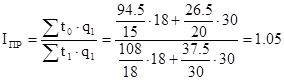 где числитель – затраты труда на выпущенную в отчетном периоде продукцию при условии её базисной трудоемкости, а знаменатель – фактические затраты на ту же продукцию в отчетном периоде; t0
