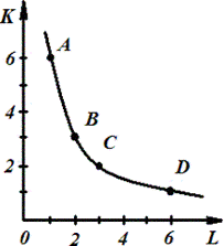 Любое сочетание факторов производства, например, 6К и 1L, 3К и 2L, 2К и ЗL, 1К и 6L обеспечит одинаковый физический объем продукции. Но какое сочетание будет самым дешевым для предпринимателя? Учитывая данные этой таблицы, на рис. 2 построим кривую равного продукта