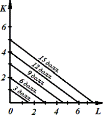 . Каждая точка на этой линии показывает различные сочетания К и L, но общие расходы будут составлять одну и ту же величину — 3 долл.