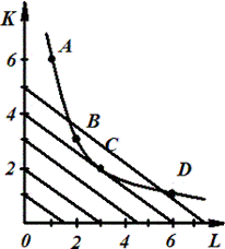 ). Все точки этой кривой А, В, С, Д показывают различное сочетание факторов производства для выпуска 100 единиц продукции.