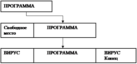 Тело вируса записывается в начало файла, а часть вируса обеспечивающая восстановление программы – в конец