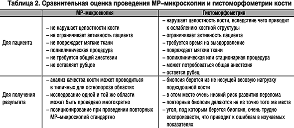 Преимущества МР–микроскопии по сравнению с гистоморфометрией представлены в таблице 2.