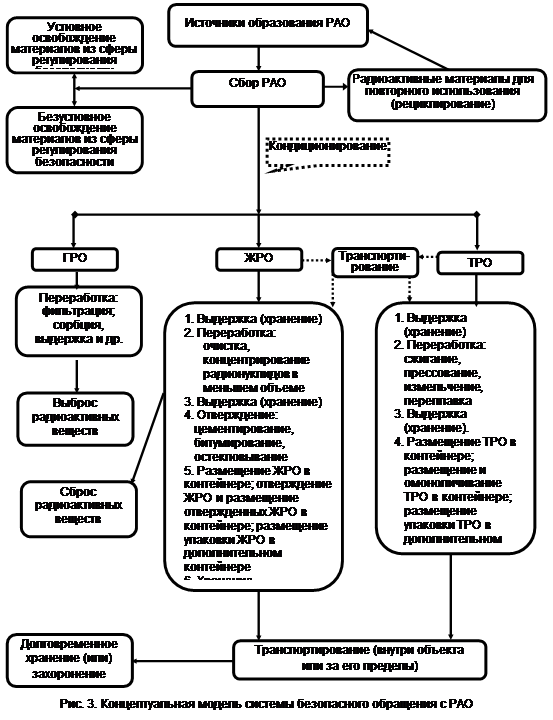 В отношении образующихся в настоящее время РАО в большинстве случаев могут быть последовательно реализованы все этапы предложенной модели безопасного обращения с РАО. Однако для РАО, накопленных в результате предыдущей деятельности, такой подход осуществим ограниченно. В большинстве случаев на указанных объектах накоплено значительное количество РАО, а сами хранилища, либо не имеют требуемой с точки зрения современных представлений о безопасности системы физических барьеров на пути возможного распространения ионизирующего излучения и радиоактивных веществ, либо существующая система физических барьеров ненадежна и несовершенна.