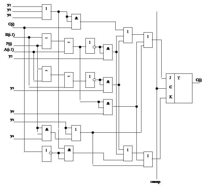 и сигналы логических условий, =1 и =0, под действием этих сигналов и при поступлении синхроимпульса из генератора синхроимпульсов (ГСИ) триггеры управляющего автомата переходят в состояния: T1