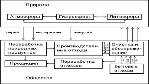Стрелочками 1, 2, 3, 4 обозначены потоки отходов: газообразных, жидких, твёрдых, энергетических.