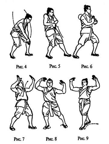 2. Руки поднять перед собой. Они как бы держат мяч — правая сверху, левая снизу, ладони друг против друга (рис. 2). Руки разводятся в стороны: левая — влево-вверх и выпрямляется, ее ладонь при этом поворачивается от себя и затем к себе; правая - влево-вниз и выпрямляется, ее ладонь при этом поворачивается вначале от себя, затем к себе. Одновременно левая нога делает полшага влево, на нее переносится тяжесть тела. Голова поворачивается, смотреть на правую руку. Так образуется поза феникса с распростертыми крыльями (рис. 3—5). Руки возвращаются в положение у груди, как указано на рис. 6. Правая рука поднимается вправо-вверх, вначале ладонью от себя, затем к себе, и выпрямляется, а левая рука - влево-вниз, вначале ладонью от себя, затем к себе, и выпрямляется. Одновременно туловище поворачивается вправо, тяжесть тела перемещается на правую ногу. Смотреть на левую руку. Вновь образуется поза феникса с распростертыми крыльями (рис. 7-8). Упражнение повторить 4 раза, включая движения и вправо и влево.