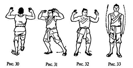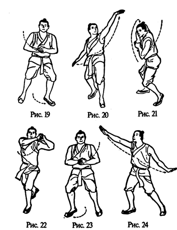 Правая рука идет вправо-вверх, описывая дугу, и выпрямляется, а левая — влево-вниз, также описывая дугу, и выпрямляется. Ладони рук впитывают земную „инь" (рис. 24). Затем правая рука возвращается по центральной линии в исходное положение, а левая рука снизу-вверх, описывая дугу через высшую точку над головой, возвращается в положение перед грудью. Здесь она соединяется с правой в традиционном китайском рукопожатии (рис. 25). Сомкнутые кисти рук поднимаются до уровня перед правой щекой. Одновременно правая йога сгибается. Ее