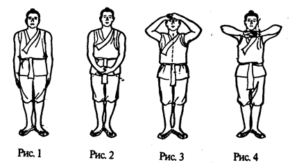 Встать прямо, ноги поставить на ширину плеч, руки опушены свободно, все мышцы расслаблены, смотреть перед собой (рис.1).