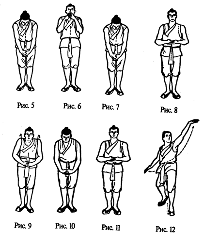 ступня образует со ступней левой ноги угол. Тяжесть тела перемещается на правую ногу. Принимается поза приветствия (рис. 26). Заканчивается часть этого упражнения позой приветствия вправо-вперед.
