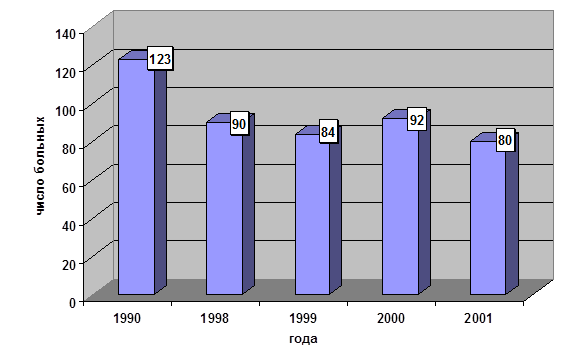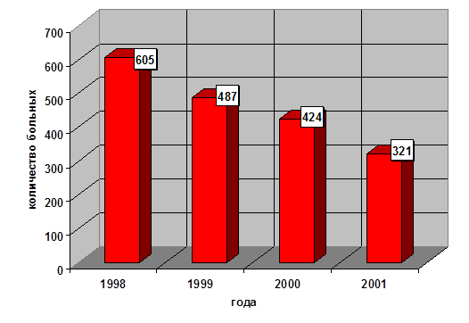 Количество осложнений в 2000 году (90 больных) – 11, в том числе инфильтратов брюшной полости – 7, абсцессов брюшной полости – 2, продолженных перитонитов –2. Количество осложнений в 2001 году (80 больных) – 8, в том числе инфильтратов брюшной полости – 5, абсцессов брюшной полости – 1, продолженных перитонитов –2, причем в 2001 году продолженный перитонит обусловлен в обоих случаях изначально неверной тактикой при первой операции.