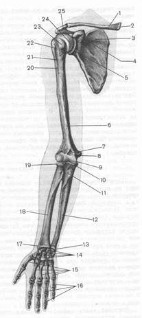 фаланги пальцев, 17 — шиловидный отросток лучевой кости, 18 —