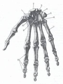 Вид спереди: 1 — кость-трапеция, 2 — ладьевидная кость, 3 — полулунная кость, 4— трехгранная кость, S — гороховидная кость, 6 — крючковидная кость, 7— пястная кость, 8 — фаланги пальцев, 9 — головчатая кость, 10 — трапециевидная кость