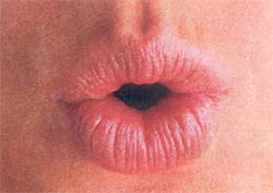 Для этого пациента (ребенка или взрослого) просят надуть воздух за щеки. Губы герметично сомкнуты, но по тому, как выглядит при этом красная кайма, судят о тонусе. Чтобы оттренировать нормальный тонус обеих губ, такое упражнение надо повторять 10 мин ежедневно. А достичь большей эффективности можно другим упражнением: надуванием воздуха за "атоничную" губу, чаще всего - нижнюю. Если у пациента развился ангулярный хейлит, то назначается упражнение для углов рта: поочередное надувание щек и "хоботок".