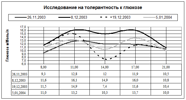 Если в ПТТГ гликемия натощак не превышает 140 мг%, через 2 часа после приема глюкозы выше 140 мг%, но не более 200 мг%, а в промежуточных точках не выше 200 мг%, тогда такое состояние называют нарушенной толерантностью к глюкозе(НТГ). Следует иметь в виду, что далеко не во всех случаях НТГ переходит в дальнейшем в сахарный диабет: толерантностью к глюкозе может восстановиться или остаться нарушенной на неопределенно долгое время.