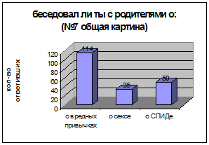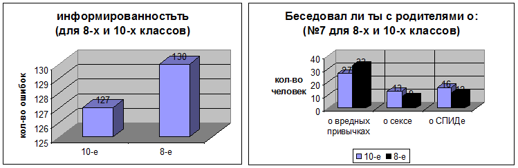 Рассмотрим результаты вопроса №7(диаграмма4). Заметны довольно странные показатели: о вредных привычках в 8-ом классе бесед с родителями было больше, чем в 10-ом. Это можно объяснить постепенной «адаптацией» наших родителей к современной жизни: мол человек в десятом классе- всё уже знает, человек в восьмом классе- надо с ним поговорить, но не о сексе и о СПИДе, а о вредных привычках. Странная склонность родителей разговаривать о СПИДе, не затрагивая при этом тему секса, видна в обоих случаях, что доказывает их некомпетентность в данной области.