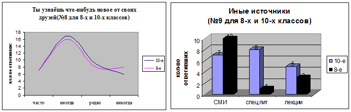 С помощью диаграммы5 легко заметить, что СМИ, которое в восьмом классе играет доминирующую роль, в десятых – ушли на второй план, а на первый, как не странно, вышла специальная литература, которая в восьмом классе стоит на последнем месте. Это говорит о том, что два года- это большой срок, за который личность подростка меняется, взрослеет.