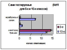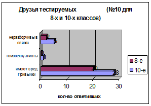 Диаграммы 8 и 9 нам показывают, что 10-классники имеют гораздо больше друзей, имеющих вредные привычки, по сравнению с 8-классниками, в то время как лиц с вредными привычками наоборот, больше в восьмых классах. Отсюда можно сделать вывод, что ученики 8-х классов более подвержены вредному влиянию, в то время как 10-классники уже поменяли свой круг интересов, что подтверждают две пары верхних столбиков в диаграммах 8 и 9.