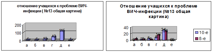 Отношение к данной проблеме мы изучили с помощью специфического вопроса-ситуации(13). Глядя на диаграмму(см. диаграмму10) видно, что большинство подростков сами готовы бороться со СПИДом как с проблемой социальной, но, скорее всего, не знают как, о чём свидетельствует сравнительно низкий показатель информированности, а также то, что треть ответила «На тебя это не повлияет». Мы это вывели из того, что достаточно малое количество тестируемых готово пренебречь дружбой, и достаточно много людей готово помочь другу, узнав, что он заражён ВИЧ. также можно заметить, что они далеки от сознания того, что такого человека можно уважать.