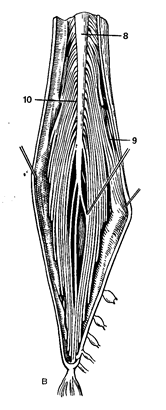 Начиная с 4-го месяца развития плода, спинной мозг отстает от роста позвоночника. В связи с этим происходит изменение направления следования корешков. У взрослого человека корешки краниальных сегментов еще сохраняют горизонтальный ход; в грудном и верхнем поясничных отделах корешки следуют косо - вниз и латерально; в нижнем поясничном и крестцово-копчиковых отделах корешки, направляясь к соответствующим межпозвоночным поясничным и крестцовым отверстиям, располагаются в позвоночном канале почти вертикально. Совокупность передних и задних корешков нижних поясничных и крестцовокопчиковых нервов окружает терминальную нить наподобие конского хвоста