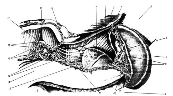 | Рис.1. Топография селезенки, ее сосуды и нервы. 1 – левый надпочечник; 2 – левая почка; 3 – желудок; 4 – левая желудочно-сальниковая артерия; 5 – диафрагма; 6 – почечная поверхность селезенки; 7 – желудочная поверхность селезенки; 8 – ворота селезенки; 9 – поперечная ободочная кишка; 10 – селезеночный лимфатический узел; 11 – панкреатический селезеночный узел; 12 – селезеночная вена; 13 – поджелудочная железа; 14 – селезеночная артерия и селезеночное нервное сплетение; 15 – нервные узлы чревного сплетения; 16 – чревные лимфатические узлы; 17 – брюшная часть аорты; 18 – левая желудочная артерия. |