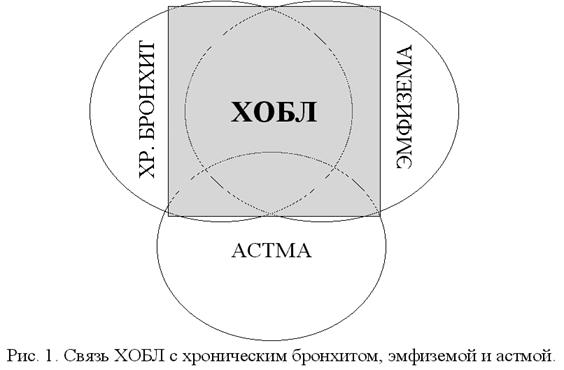 Довольно распространенная классификация, в которой выделялись хронический простой, обструктивный, гнойный и гнойно-обструктивный варианты за последние годы претерпела изменения и на первый план вышло разделение бронхитов по наличию обструкции, так как от этого фактора в первую очередь зависят тяжесть и прогноз заболевания. Более того, хронический обструктивный бронхит (ХОБ) часто стал подменяться термином ХОБЛ, что не вполне верно. Конечно, наиболее частой причиной ХОБЛ является ХОБ (1), но дело в том, что ХОБЛ кумулятивное понятие, отражающее состояние с медленно и необратимо прогрессирующей обструкцией дыхательных путей, в основе которой лежит не только воспаление и склероз, свойственные для бронхита, но и деструкция ацинарной ткани с потерей эластических свойств легких, что характерно для эмфиземы. ХОБЛ является собирательным понятием и объединяет в себе такие заболевания как: хронический обструктивный бронхит, эмфизему легких и бронхиальную астму тяжелого течения. Видимо, более верно говорить о том, что ХОБЛ является заключительным этапом любой обструктивной патологии (рис.1). Именно поэтому выделение ХОБ имеет важное значение, позволяя при ранней диагностике проводить адекватную терапию, направленную на устранение обратимого компонента бронхиальной обструкции (4). В связи с этим, при формулировке диагноза в тех ситуациях, когда можно выделить нозологическую принадлежность заболевания (что характерно для ХОБЛ легкой и средней степени тяжести), термин ХОБЛ следует опустить и ограничиться указанием нозологии, степени тяжести, фазы заболевания и наличия осложнений (5).
