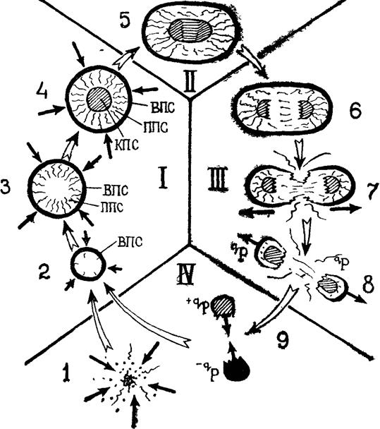 I — этап концентрации материи системой: II — переходный, или этап поляризации системы; III — этап рассеяния материииз системы; IV — этап самоорганизации предструктур (1) или новых протоструктур за счет взаимодействия радикалов (9); 1— 9 — стадии самодвижения активной системы; 1 — предструктура; 2 — протоструктура; 3 — незрелая структура; 4 — зрелая структура; 5 — поляризованная структура: 6 — структура с разорванным центром; 7 — распадающаяся структура; 8 — образование радикалов; 9 — взаимодействие радикалов с образованием новой протоструктуры (2); ВПС — воспринимающие подструктуры, ППС — проводяще-преобразующие подструктуры; КПС — концентрирующие подструктуры; qP — радикалы.