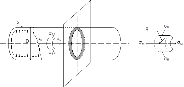 Для хранения сжатого газа при высоких давлениях обычно применяются тонкостенные цилиндрические резервуары-баллоны, представляющие собой цилиндрическую оболочку вращения. Оболочка считается тонкостенной, если толщина стенки в 20-30 раз меньше диаметра баллона. Такая оболочка может рассчитываться по безмоментной теории, следовательно элемент стенки баллона работает только на растяжение-сжатие, таким образом гипотеза о малой толщине стенки сводится к тому, что изгибающими моментами, возникающими в стенке баллона можно пренебречь; в этом случае для определения действующих в оболочке нормальных напряжений можно пользоваться известным уравнением Лапласа (см. рис. 4)