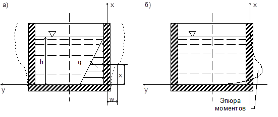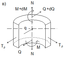 Для расчета толстостенной цилиндрической оболочки приходится применять моментную теорию, основанную на гипотезе, что и в стенке оболочки действуют наряду с нормальными напряжениями еще и поперечные силы и изгибающие моменты (рис. 5). Это уточненная модель приводит к совершенно иным уравнениям (дифференциальному уравнению четвертого порядка)