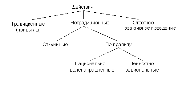 Целенаправленные действия стремятся к успеху, используя внешний мир как средство, ценностно-рациональные действия не имеют какой-либо цели и являются самоценными. Образ мыслей людей первого типа действий следующий : "Я ищу, достигаю, используя других", второго типа действий - "Я верю в какую-то ценность и хочу действовать ради этого идеала, даже если это вредит мне” . Далее, необходимо перечислить