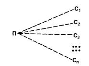 В схеме показано, что причинно-следственная связь направлена от причины к порожденному ею следствию. Значит, причина и следствие — асимметричны, и отношение между ними необратимо. Имеется в виду, что причины вызывают не любые, а определенные, соответствующие им следствия. Скажем, из косточки винограда вырастает виноградная лоза, из семени чертополоха — чертополох. Эта схема — назовем ее простой схемой причинности — служит основой более сложных схем причинных отношений, охватывающих множество практически одновременно действующих причин. Графическая модель такого соотношения выглядит следующим образом:
